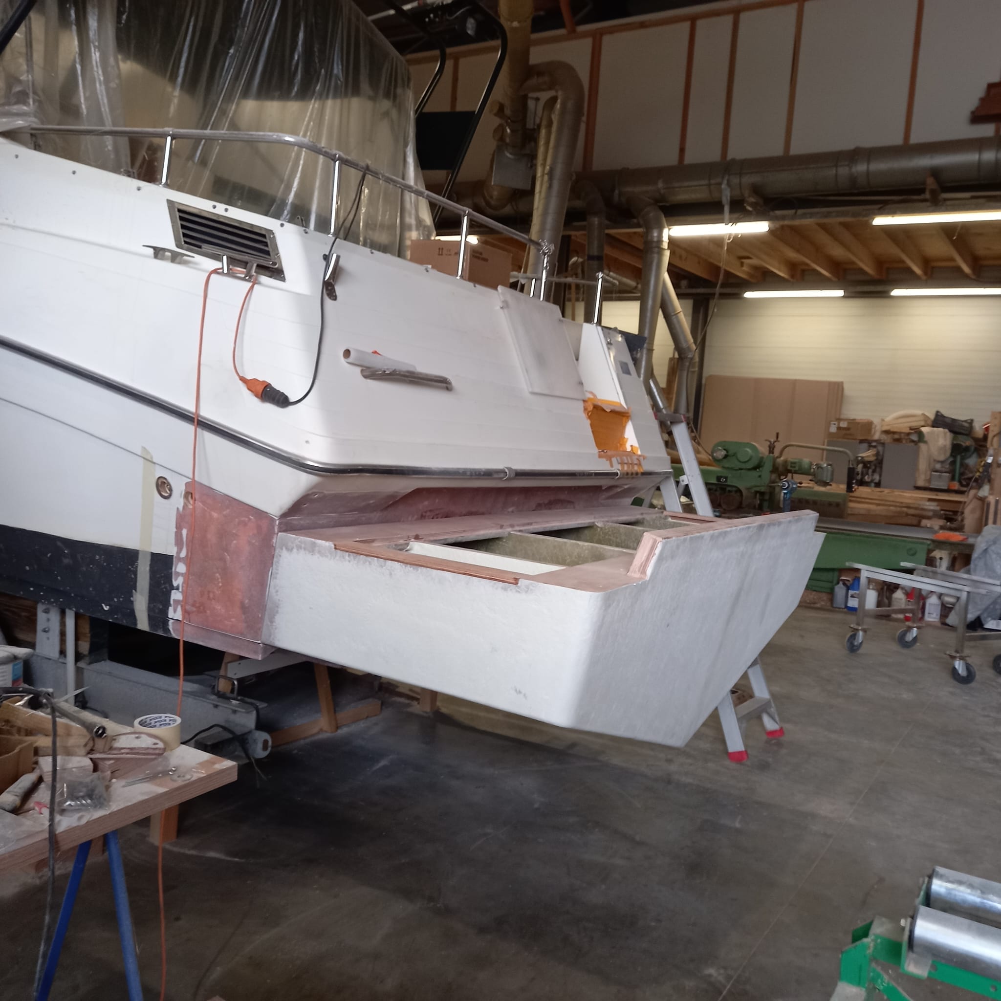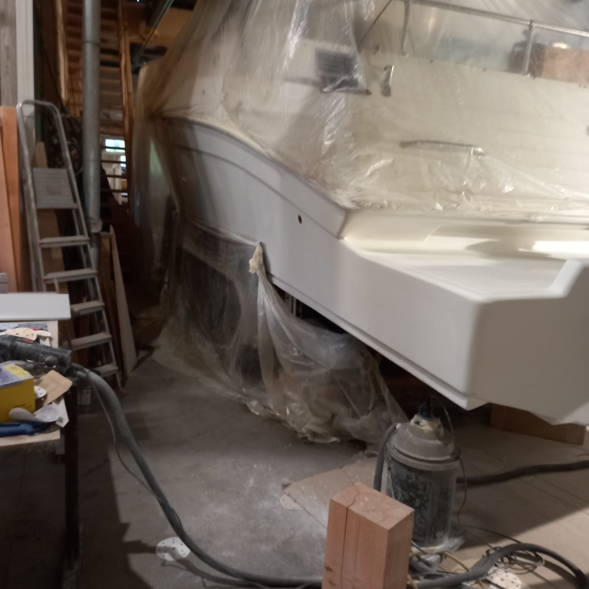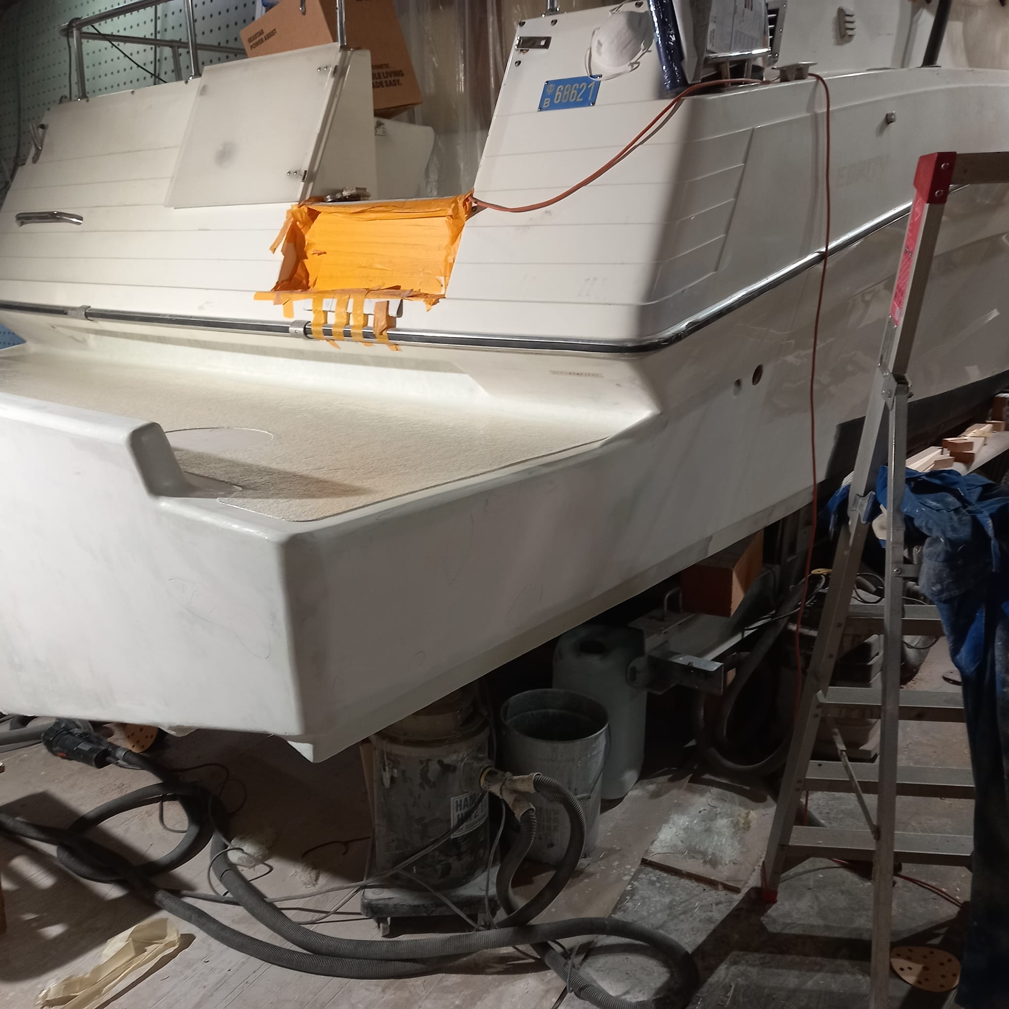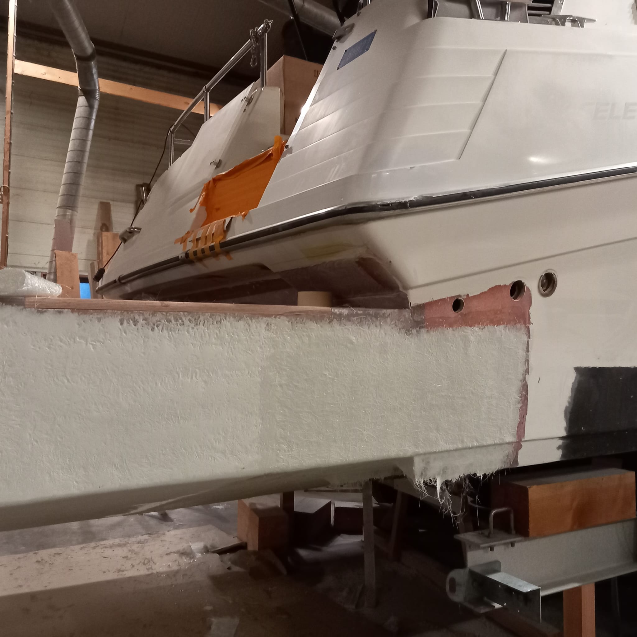 - Herstel: Gaten moeten worden opgevuld met glasvezel en polyesterhars. Het beschadigde gebied wordt eerst geschuurd om een schone, ruwe oppervlakte te verkrijgen. Daarna wordt een glasvezelmat in meerdere lagen aangebracht en met polyesterhars geïmpregneerd. Na uitharding wordt het oppervlak geschuurd, geplamuurd en afgewerkt met gelcoat.